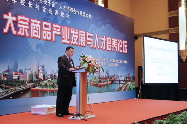 5月27日下午,作为宁波市第二届“百校千企”人才培养合作交流大会主要内容之一的“大宗商品产业发展与人才培养论坛”在香格里拉大酒店举行。西安邮电大学副校长温小郑博士、商务部国际贸易合作研究院市场研究部副主任白明研究员、北京工商大学证券期货研究所所长胡俞越教授、宁波神化化学品经营有限责任公司高级分析师纪鸿聪、长城企业战略研究所执行总监王峰等应邀为本次论坛作专题报告。宁波市委人才工作领导小组办公室副主任刘骏、市教育局副局长胡赤弟、市科技局副局长何晓南、市科协秘书长张定科,我校领导孙惠敏、李羽、高振强等出席了本次论坛。论坛由副校长张舜德主持。
