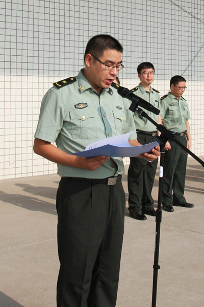 授旗仪式后,学生处处长、军训师政委吴勇作军训动员讲话。他要求全体参训人员以饱满的政治热情、积极的学习态度投身到军事训练中去;用科学的方法、严明的纪律开展好各项军训工作;牢固树立“安全第一”的指导思想,确保军训工作顺利进行。