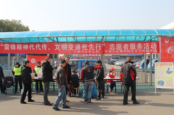 3月4日上午,为纪念学雷锋活动50周年,增强青年学生、企业员工的社会责任感,艺术与传媒学院与宁波汽车客运中心共同开展了“雷锋精神代代传,文明交通我先行”的志愿者服务活动。