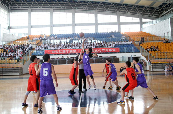 仪式后,举行了本届体育文化节男子篮球赛的首场比赛。经过激烈角逐,机电学院男篮队以38:35险胜高职学院男篮队。