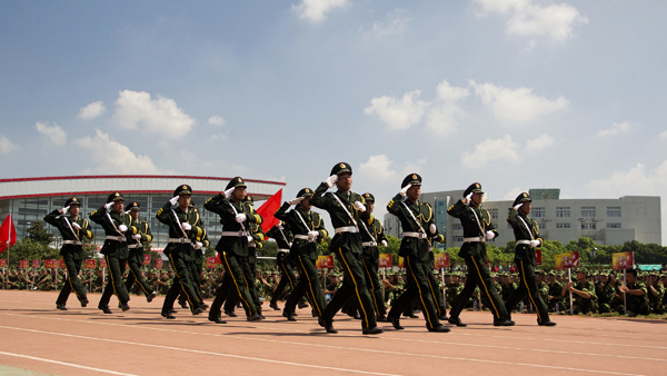 升旗仪式后,阅兵式正式开始。校党委书记孙惠敏在副书记林长兴、副校长李羽陪同下首先对军训师进行了检阅。随后,在雄壮的解放军进行曲中军训师进行了分列式表演,各方队激情高亢的口号、整齐划一的步伐、昂扬向上的军容赢得了在场领导和师生的阵阵掌声。