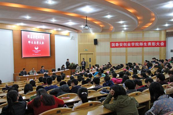3月31日晚,一场特殊的表彰会在我校行政楼报告厅举行,深圳国泰安信息技术有限公司为我校国泰安创业学院任课教师颁发奖教金,为2013级优秀学生颁奖。蓝源金融投资集团董事长廖文剑、深圳国泰安信息技术有限公司执行总裁唐应元、副校长李羽等出席表彰会,参加会议的还有教务处、国泰安创业学院等部门相关负责人及创业学院全体师生。表彰会由创业学院行政副院长高宝岩主持。