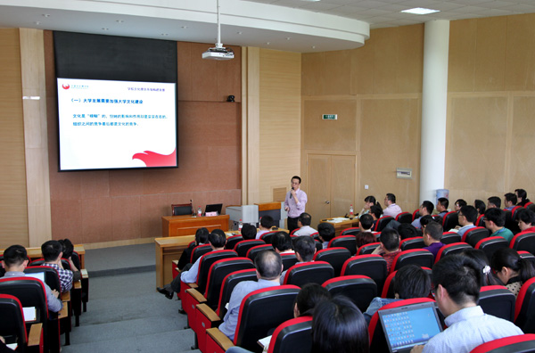 报告中,校长助理沈云慈从背景、内涵与实践三方面全面深入地解读了学校文化理念系统。他从大学文化建设的重要性谈起,通过对我校文化理念系统建设过程的回顾与梳理,介绍了我校文化理念系统的构建背景。他说,大学是文化的载体,文化是大学的灵魂。大学的建设与发展需要大学文化为其注入坚强的生命底蕴,并发挥出强有力的价值导向、群体凝聚、情操陶冶和社会辐射等一系列功能。目前,我校正处在转型发展的关键时期,亟需用文化来引领和推动,大学文化建设显得尤为重要。在学校十余年的创办、建设、发展过程中,蕴含着一种信念、一种力量、一种精神,由此也孕育了我校的大学文化,学校文化理念系统正是对这一文化的总结和提炼。