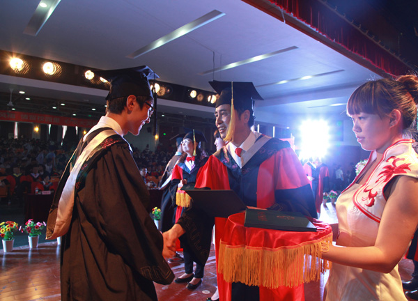 台上,校合唱团倾情演绎的《祝福》乐曲激扬;台下,等待授予学士学位的毕业生们个个意气风发,端正的学位帽,庄重的学位服,映衬着一张张青春洋溢而甜蜜的笑脸,整个大厅弥漫着收获的喜悦。