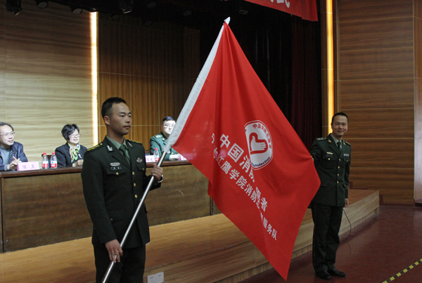 何秋叶与李宿龙分别代表校警双方签署了共建协议。此外,李宿龙还向我校消防志愿者代表授予了“中国消防志愿者宁波大红鹰学院消防志愿者服务队”队旗。