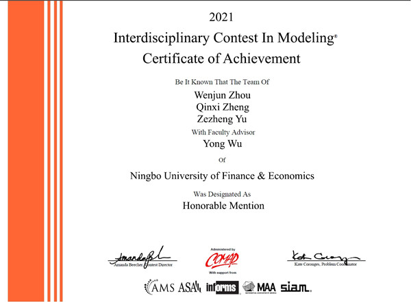 我校学子获2021年美国(国际)大学生数学建模竞赛二等奖